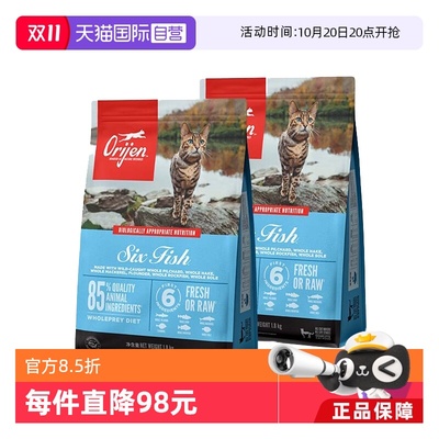 【自营】Orijen渴望美国成猫幼猫六种鱼猫粮美毛护肤1.8kg*2包512元天猫532元