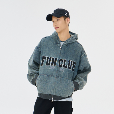 Fun潮牌连帽牛仔外套男2025年秋季新款简约字母印花休闲宽松外套329元天猫349元